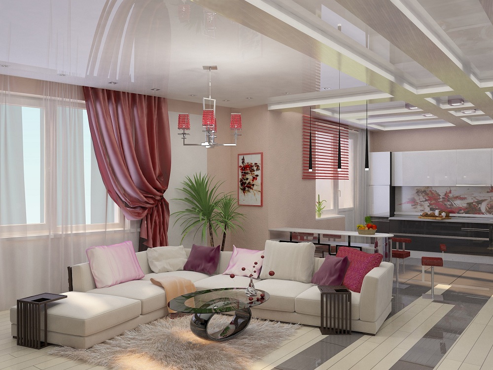Особое внимание стоит уделить потолку. Подвесная конструкция позволит соединить все функциональные зоны в одно целое