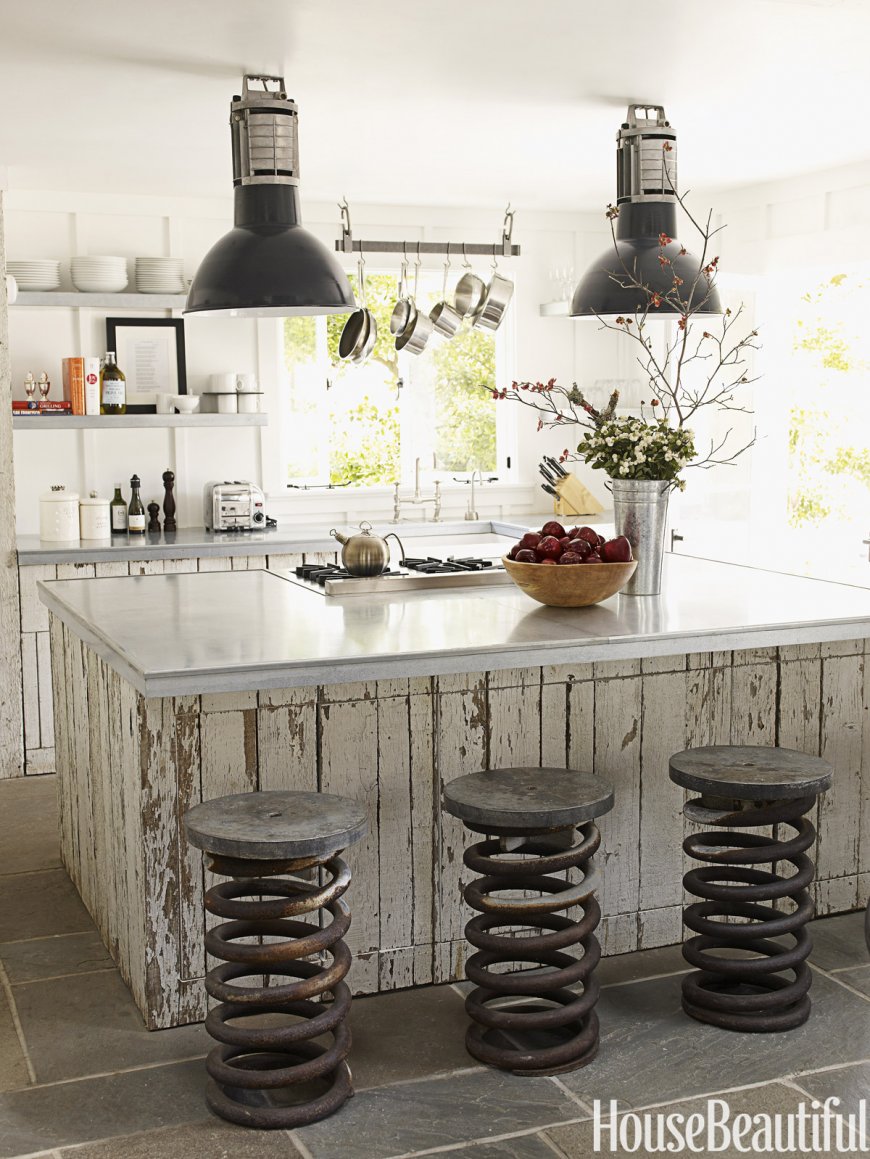 Кантри для просторного помещения провинциального интерьера. Нужны: состаренные предметы мебели, отделка из дерева, плетеные изделия, текстиль из натуральных тканей. Милая простота и экологичность, а технику придется скрыть в шкафах.