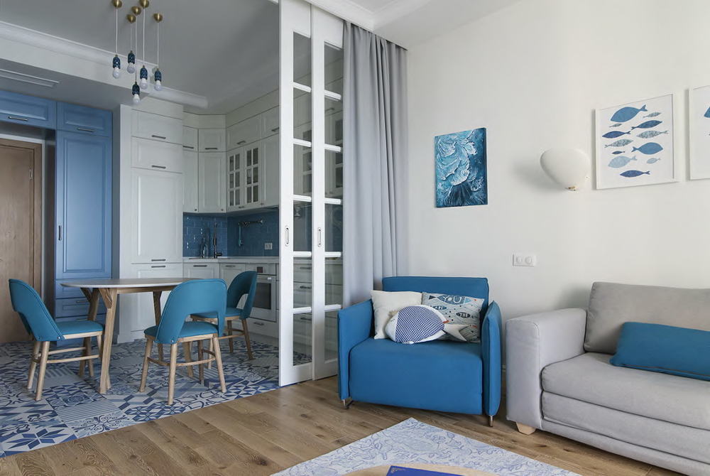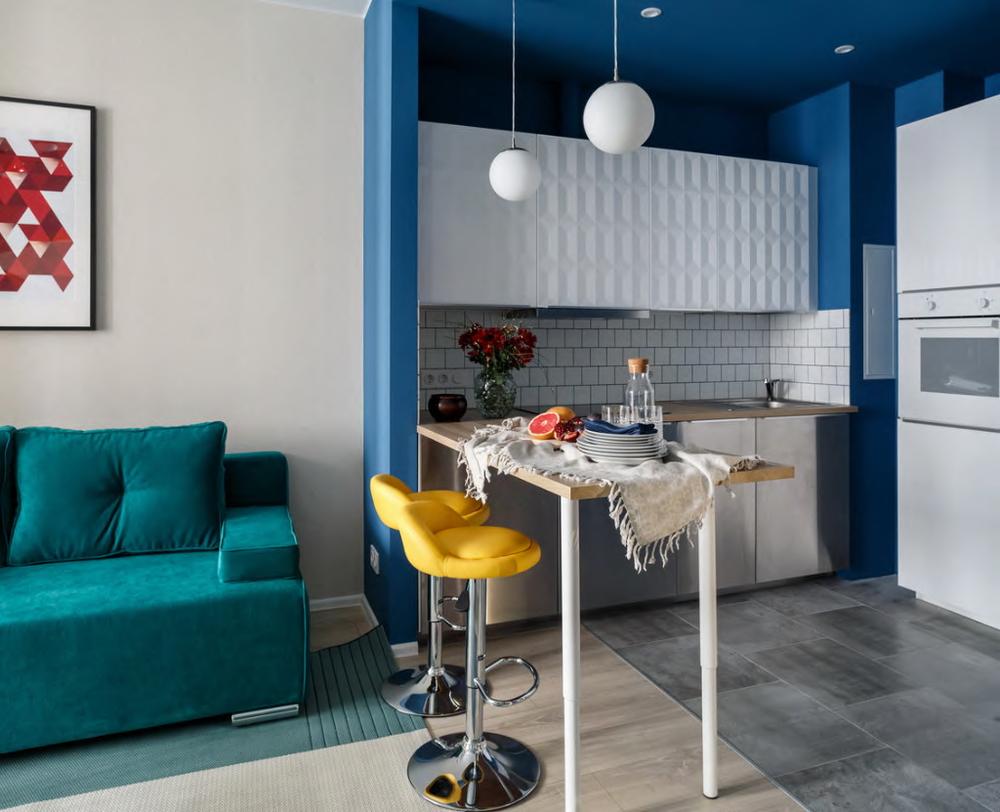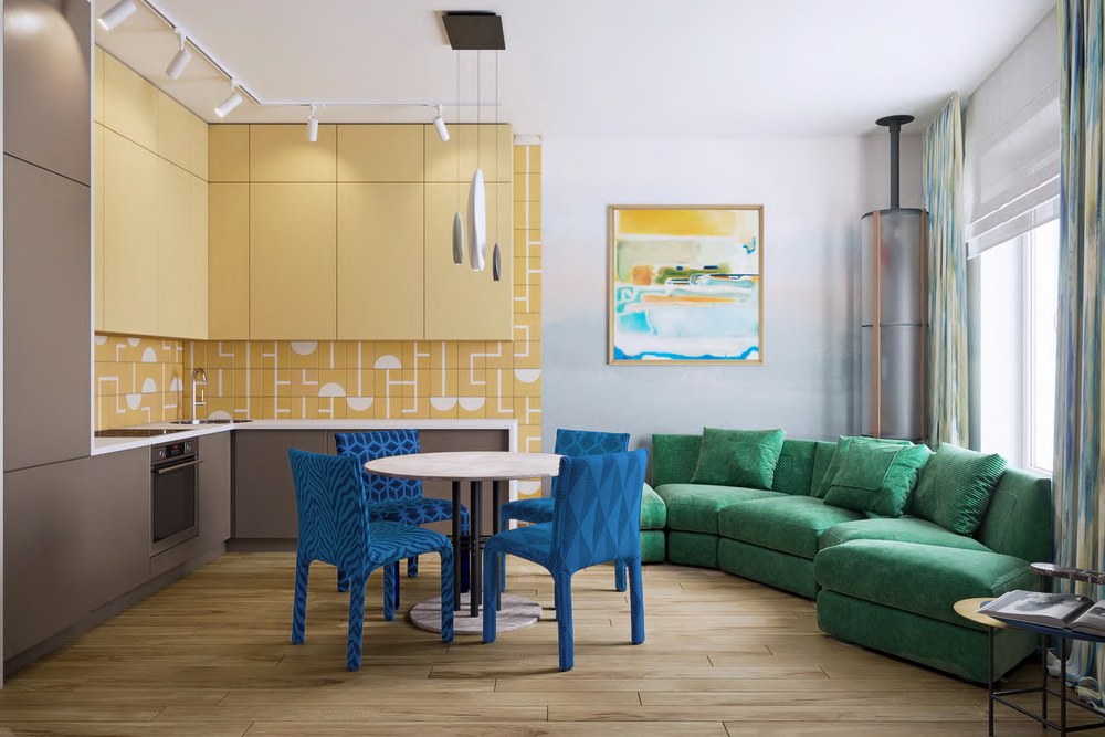 Создать эффект единого пространства поможет сочетание цветовых решений. Как вариант, можно сделать фасады кухни и стены одного цвета. Другой вариант – выбрать 2-3 основных цвета и повторить их по всему пространству гостиной-кухни или квартиры-студии. Такие решения будут сглаживать резкий переход между зонами в пространстве.