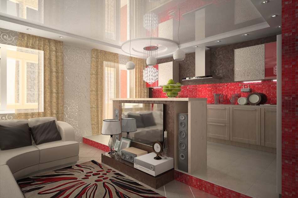 Если устроить кухню-гостиную в маленькой квартире, как будет смотреться отделка в красном цвете?