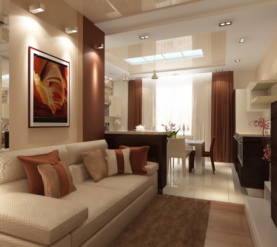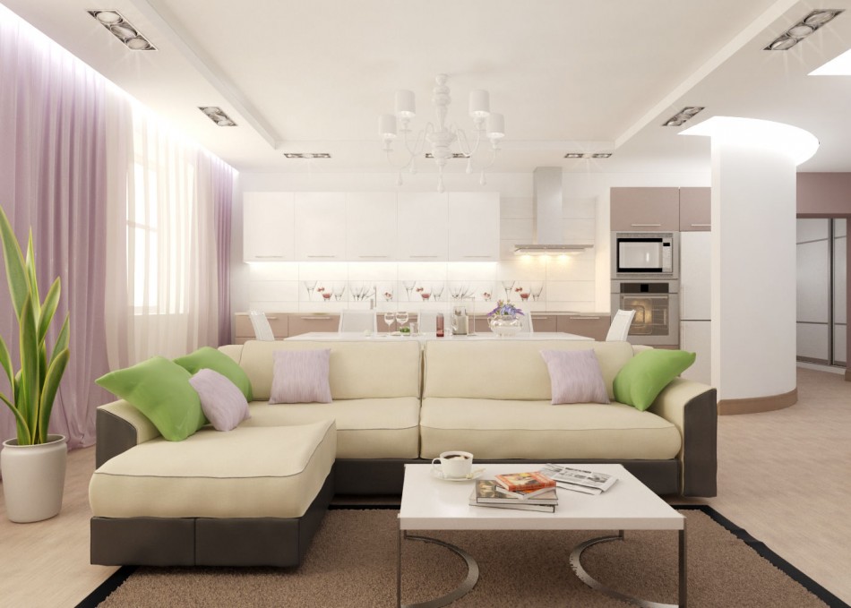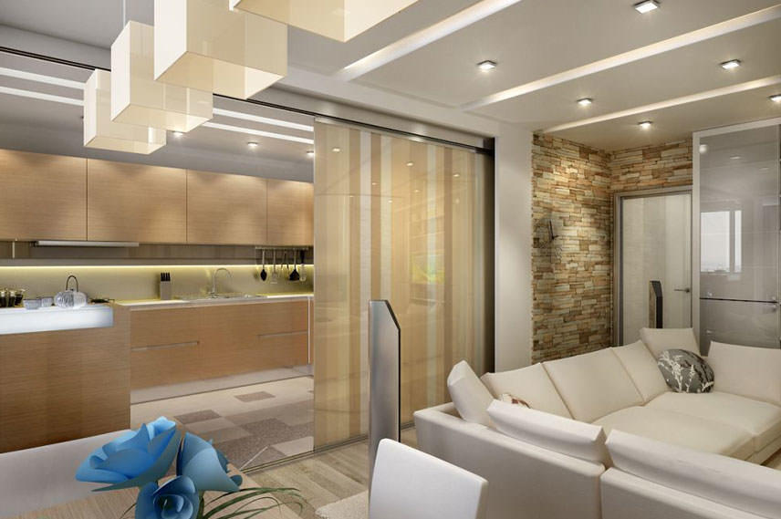 Для зонирования также часто используются колонны, арки, небольшие ширмы и перегородки. Также удачное решение это освещение, кухня должна иметь яркое освещение, а гостиная более приглушенное и уютное. Повесьте в кухне жалюзи, а в гостиной красивые шторы.