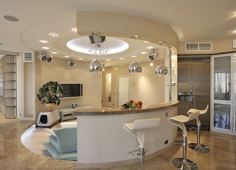 Пожалуй, самый популярный способ зонирования такого помещения – это барная стойка, которая отделяет пространство кухни от гостиной. Этот вариант особенно подойдет молодым семьям, которые любят устраивать дружеские вечеринки и фуршеты. Барная стойка достаточно функциональная вещь, она может использоваться и как место для еды, и как рабочая поверхность, и как украшение интерьера.
