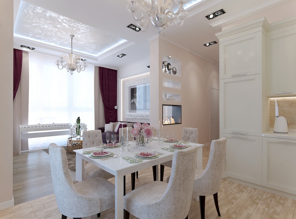 Не менее привлекательной может быть и неоклассика. Высвобождение места достигается за счет применения встроенной аппаратуры, употребления сравнительно узких верхних шкафов. Одну из стен чаще всего делают акцентной, покрывая обоями или иным покрытием с не слишком ярким орнаментом. Можно применить статуэтки, небольшие вазы для декорирования пространства. Добавить к этому или к любому другому стилю мотивы минимализма легко, стоит только выбрать мебель с лаконичной геометрией и не слишком броскими цветами.