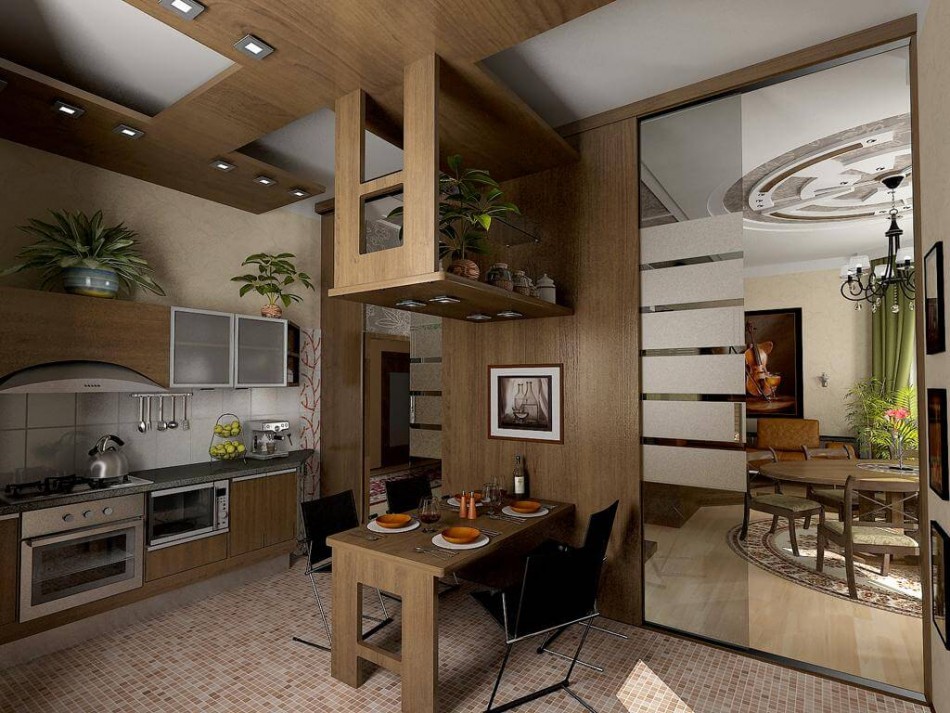 Если кухню и гостиную разделяет не перегородка, а капитальная стена, её демонтаж невозможен. Однако есть вполне приемлемый выход.