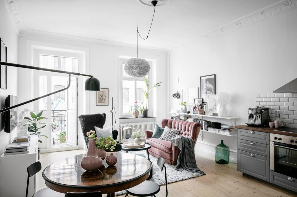 Допустимо использовать прямоугольные арки для визуального отграничения кухонной и гостиной зон; очень важно, чтобы эти помещения не сливались между собою. Скандинавский стиль характеризуется в первую очередь максимальным введением в интерьер светлых тонов, интенсивным применением натуральных материалов