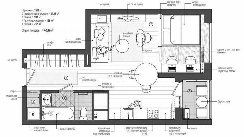 Составить подробный план расположения функциональных зон. Продумайте, сколько места вы хотели бы отвести под приготовление и прием пищи, сколько оставить на гостиную.