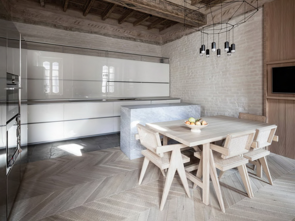 - Увеличивается полезное пространство, появляется возможность вынести обеденную зону за пределы помещения для готовки, без потери связи с ним. Это преимущество особенно ценят хозяйки малогабаритных квартир, где вопрос «куда посадить гостей или домочадцев во время еды?» стоит очень остро.