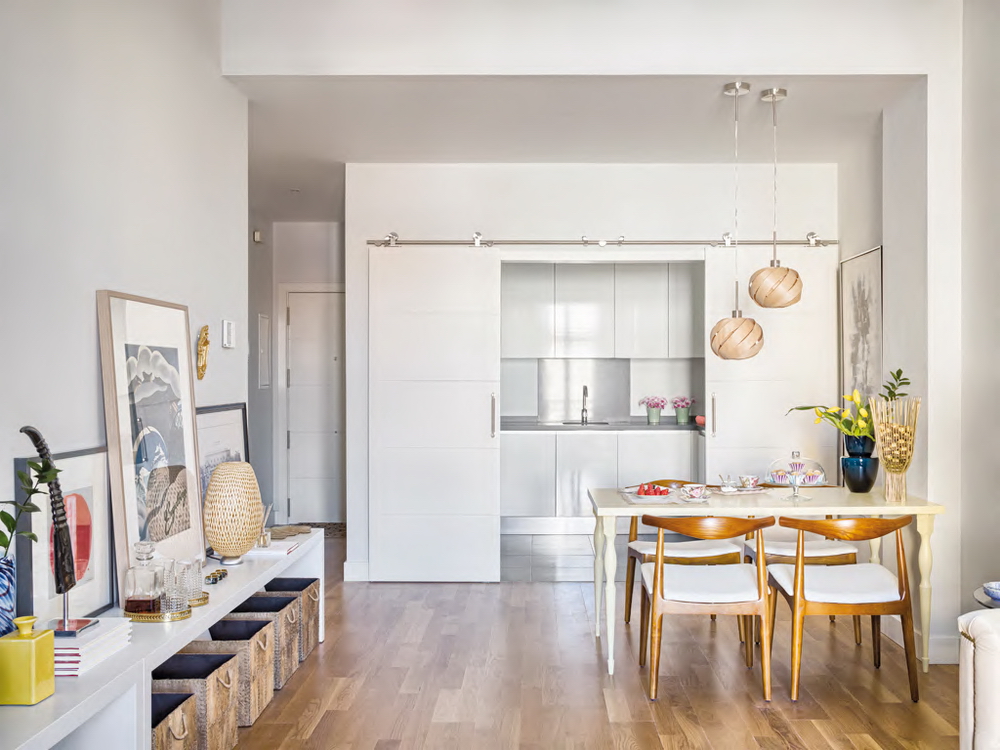 Что же делать, если на кухне газ, проводка в доме устаревшая, но присоединить гостиную очень хочется? Предлагаем пойти на компромисс и объединить комнаты частично – заменив распашную дверь раздвижной (см. фото ниже) или раскладной «гармошкой». Таким образом, вы сможете оставлять кухню открытой большую часть времени, при этом не нарушив закона.