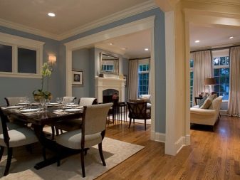 Кухонная зона может визуально подчеркиваться расположенным на потолке коробом; внутри этого короба часто размещают подсветку. Если расположить конструкцию на всем периметре помещения, она станет визуальным связующим звеном. Для покрытия стен, а иногда и потолков, в соединенных комнатах может использоваться венецианская штукатурка. Но все же более привычны другие варианты.