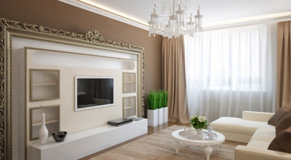 Гостиная комната, содержащая кофейные тона, всегда выглядит консервативно и роскошно. Сюда можно купить светло-кофейные обои, мебель, аксессуары и предметы быта. Кофейный цвет в гостиной сочетается с самыми разными оттенками.