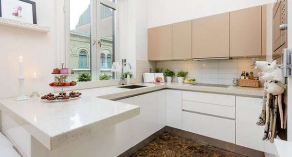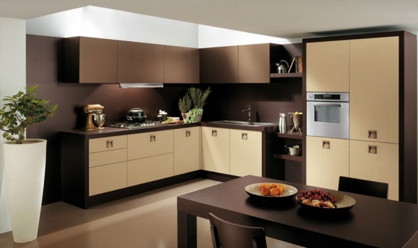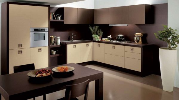- Для угловых кухонь дизайнеры рекомендуют использовать интересный прием, при котором одну сторону кухни делают кофейной, а другую – цвета кофе с молоком. Если вы решитесь воплотить эту идею на вашей кухне, будьте готовы приобретать мебель по индивидуальному заказу.