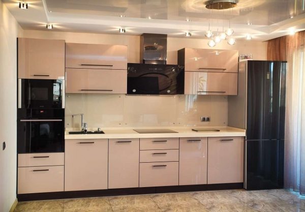 Оптимальное соотношение цветов следует подбирать, исходя из того, какого эффекта вы желаете добиться. Кухня может быть романтической, роскошной, строгой, выполненной в деревенском стиле и так далее. Подбирая глянцевый гарнитур, можно задействовать следующие сочетания.