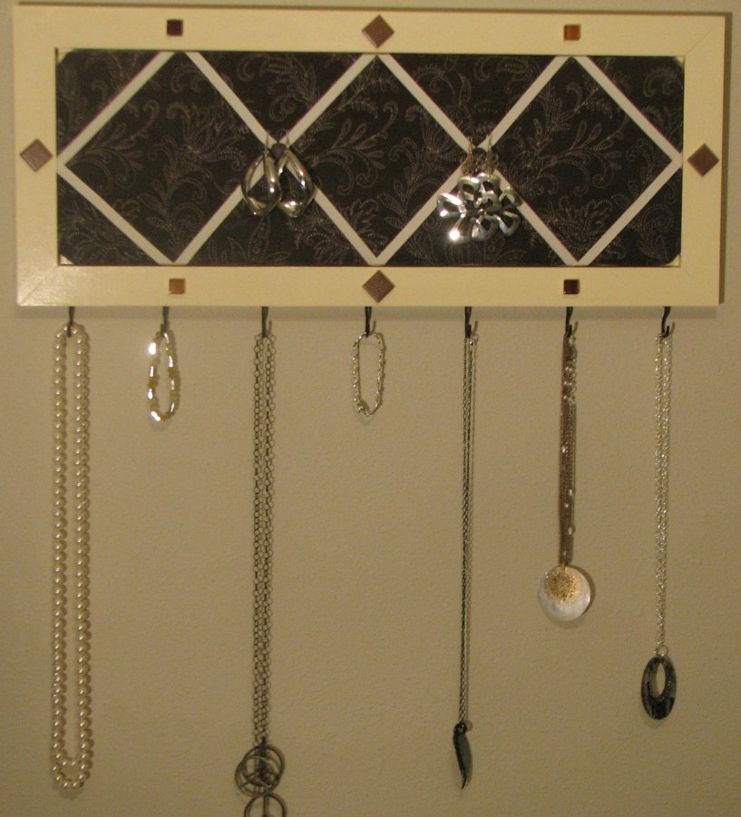 – На такой доске можно хранить и свою коллекцию украшений, так же прикалывая булавками, или цепляя, например, серьги за перетяжку. А можно сразу вкрутить крючки, или красивые маленькие, мебельные ручки, или просто вбить маленькие гвоздики и хранить бижутерию и разные штучки