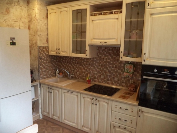 Угловая классическая бежевая кухня с фасадами МДФ. Стоимость – 1800 долларов. Общая площадь помещения 7,5 кв.м.