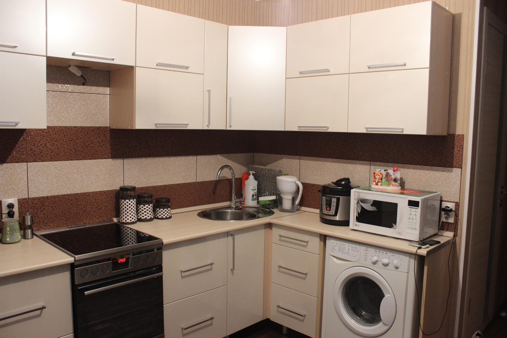 Угловая бежевая кухня в современном стиле. Стоимость – 3200 долларов. Размер помещения – 6 метров.