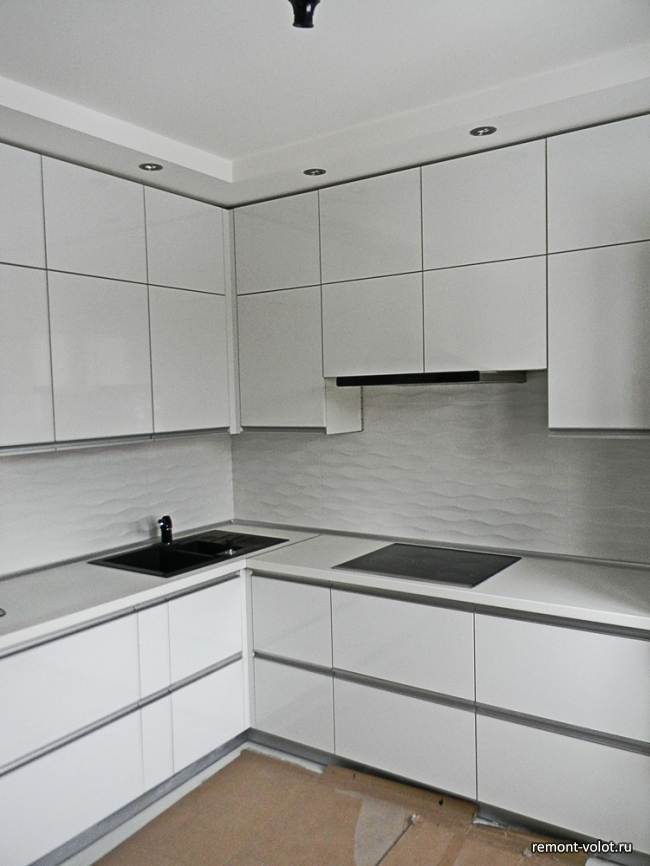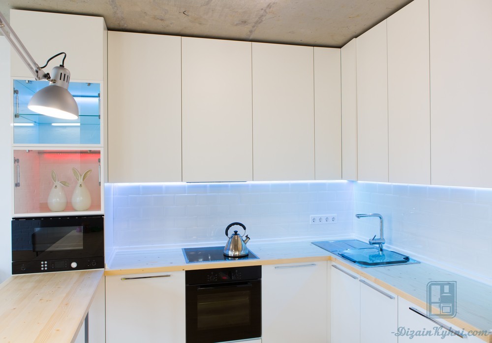 Угловая белая кухня с фасадами из МДФ в современном стиле. Стоимость – 6450 долларов. Площадь всей кухни – 8,3 кв.м.