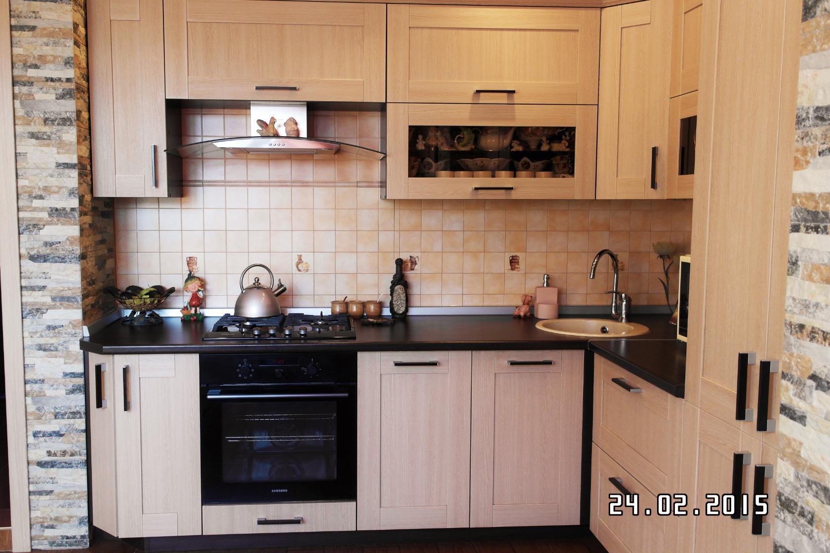 На фото деревянный гарнитур с черной столешницей, выполненный на правый угол.