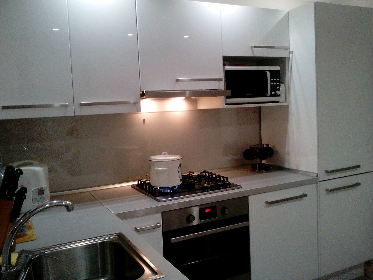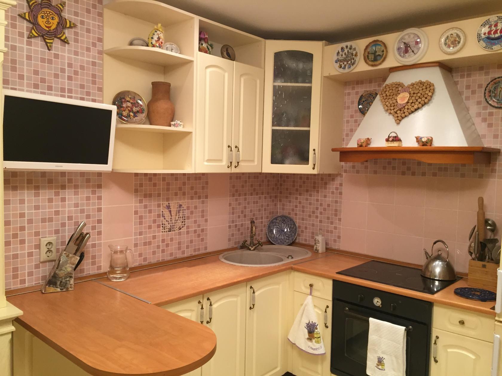 Небанальный вариант — разместить в угловой части маленького гарнитура варочную поверхность. Как утверждает на одном из популярных форумов хозяйка этой маленькой кухни, пользоваться плитой ей вполне удобно. На дальнюю конфорку она ставит чайник, а готовит обычно на ближних. Но имейте в виду: когда на плите будет кипеть кастрюля, пользоваться мойкой будет сложно — можно обжечься.