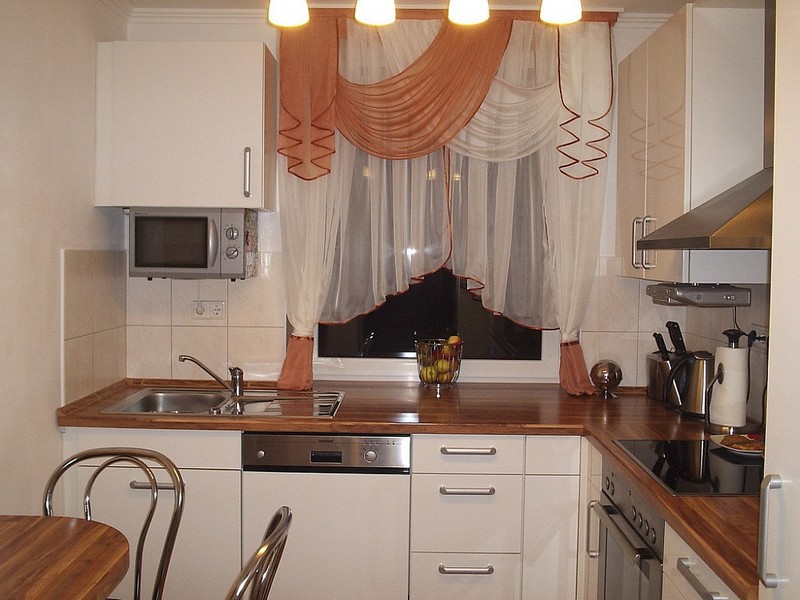 Окно на небольшой квадратной кухне лучше украсить полупрозрачной тюлью.