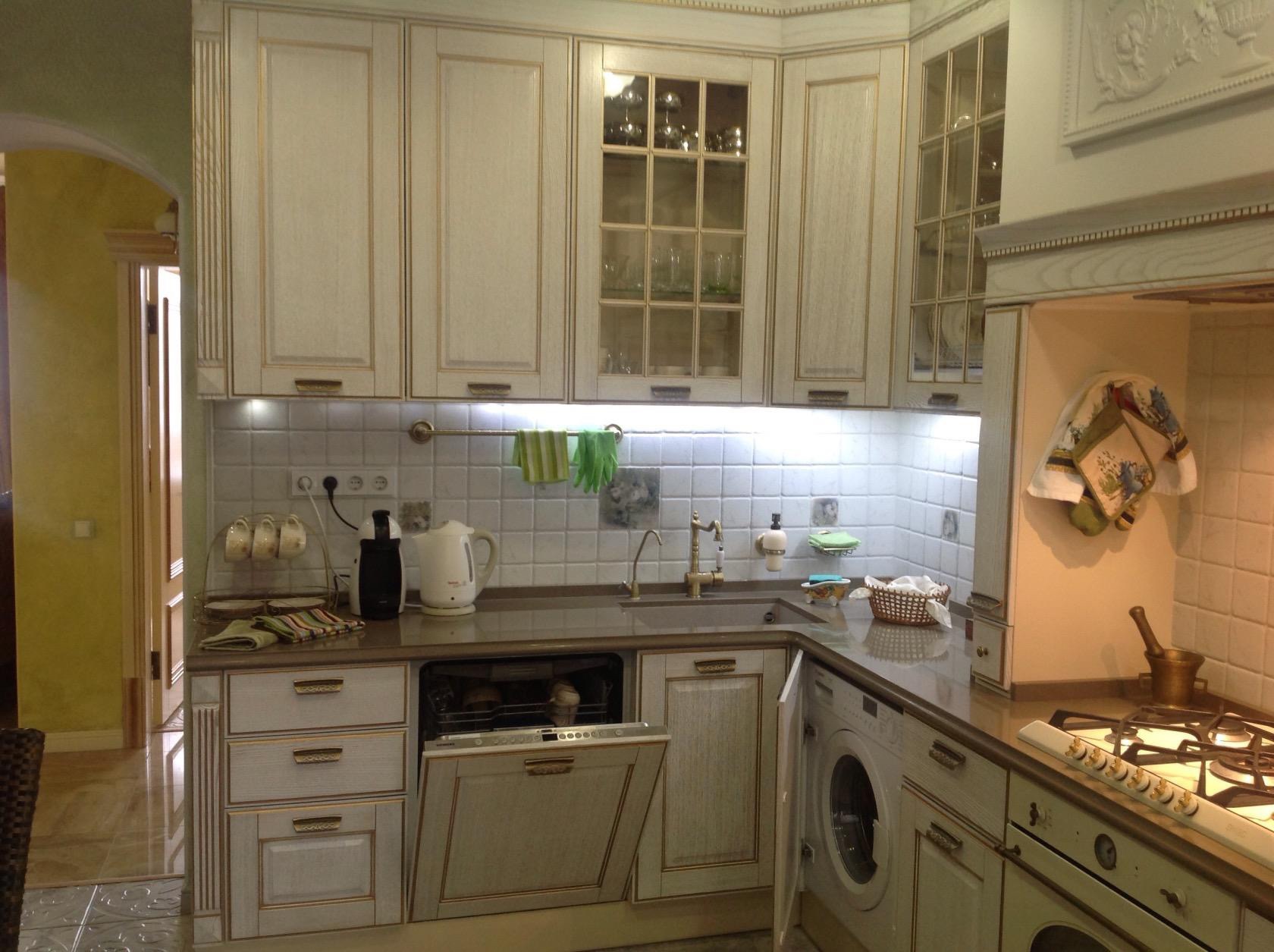 На фото интерьер со светлым угловым гарнитуром со встроенной техникой.