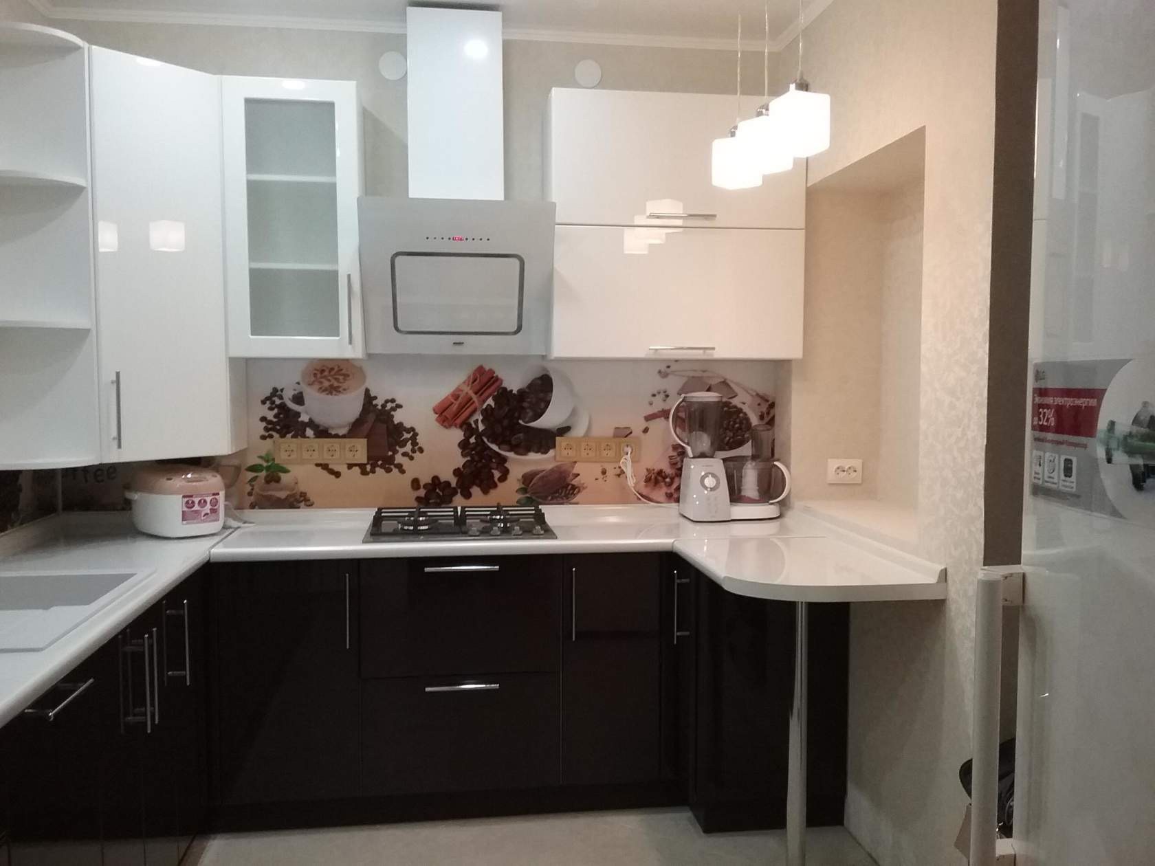 В углу на столешницу нередко ставят мелкую бытовую технику (мультиварку, микроволновку, блендер, кухонный комбайн, тостер, электрочайник), кухонную утварь (например, подставки для ножей), вешают полки на рейлингах.