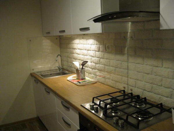 Такой способ обустройства будет отличным решением для тех хозяев, которые не будут постоянно готовить, потому как площадь рабочей поверхности у линейной планировки на порядок меньше, нежели у угловой или иных подобных типов.