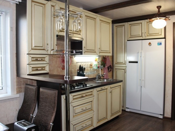 - Второй минус заключается в том, что в комнате с относительно небольшими габаритами иногда сложно установить кухонный гарнитур в одну линию.