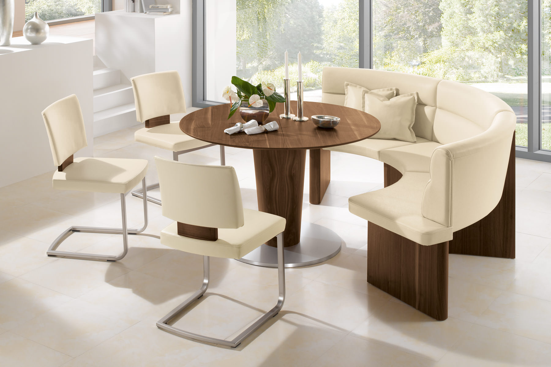 Компактный обеденный комплект углового типа получил большую популярность. Использование современных материалов и хитроумных механизмов разрешает увеличивать функциональность мебели, расширяя список ее достоинств. Например, вместо стационарной мягкой лавочки можно использовать полноценный кухонный диван раскладного типа, получая для домашних целей дополнительное спальное место.