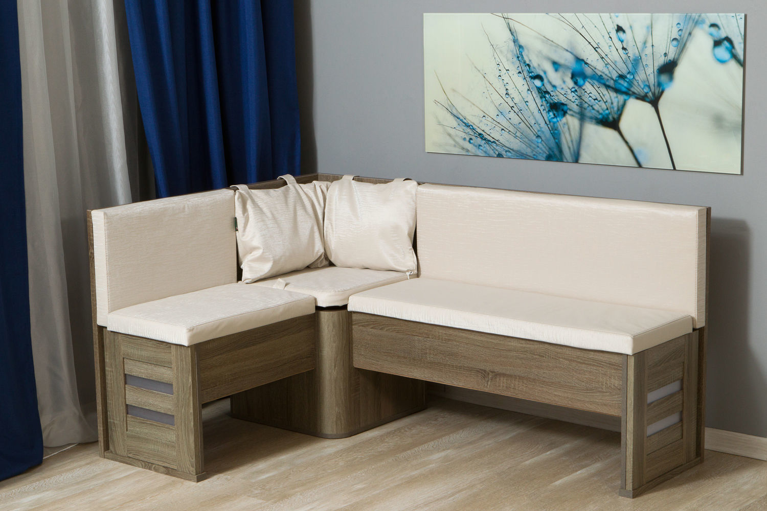 Кухонный уголок представляет собой удобный мини-диванчик, размещенный в обеденной зоне, рядом со столом.
