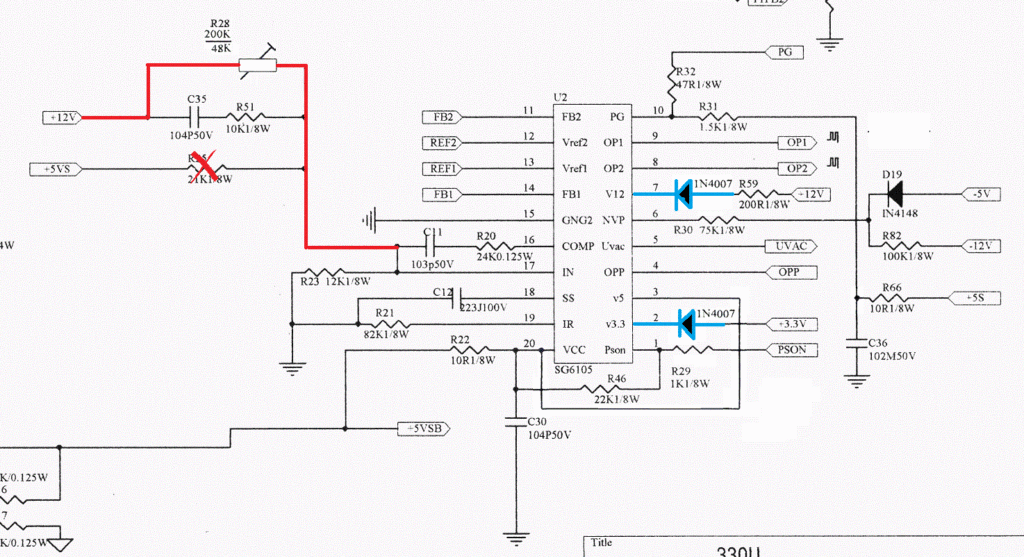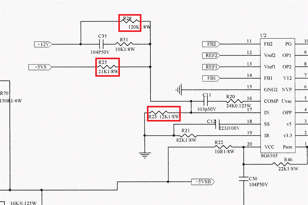 Но, если мы сейчас установим подстроечный резистор с неверными предварительными настройками, то блок выдаст, либо слишком завышенное или слишком заниженное напряжение на выходе, сработает защита и БП отключится. Для этого измеряем напряжение на 17 ноге SG6105 (в нашем блоке оно составляет 2,4 В) и рассчитываем текущее сопротивление резистора R28, для получения 2,4 В на делителе. В общем, как изображено на схеме: