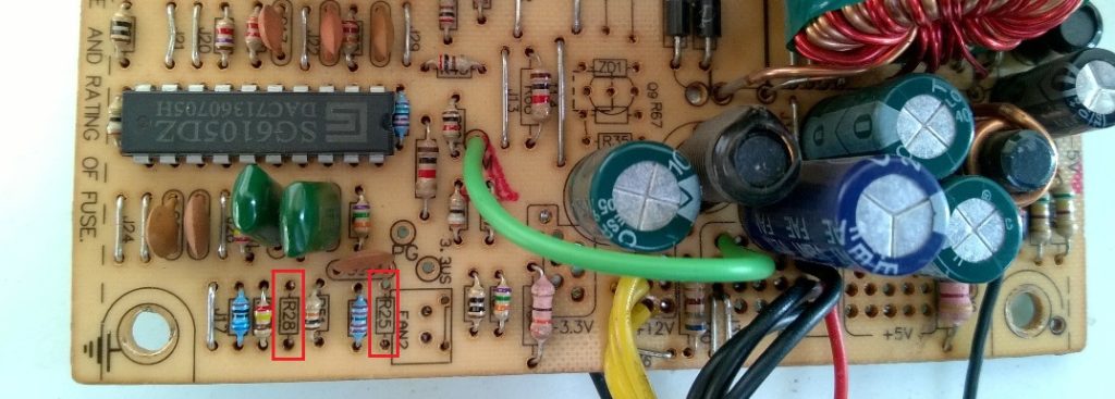 Поскольку стабилизация шины +5 В нам не нужна, то резистор R25 необходимо удалить. А R28 заменить на многооборотный подстроечный, которым мы сможем корректировать напряжение.