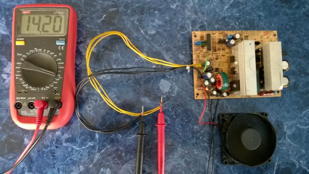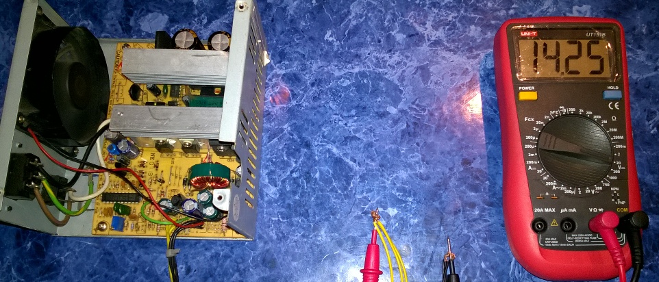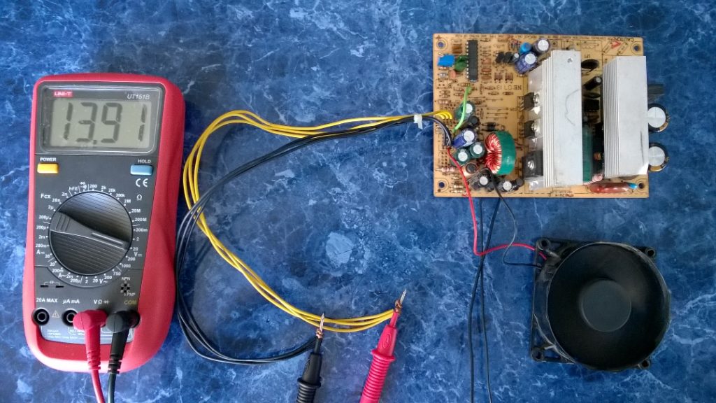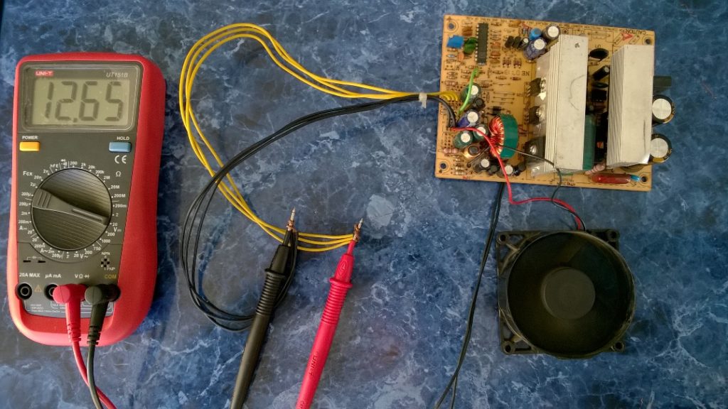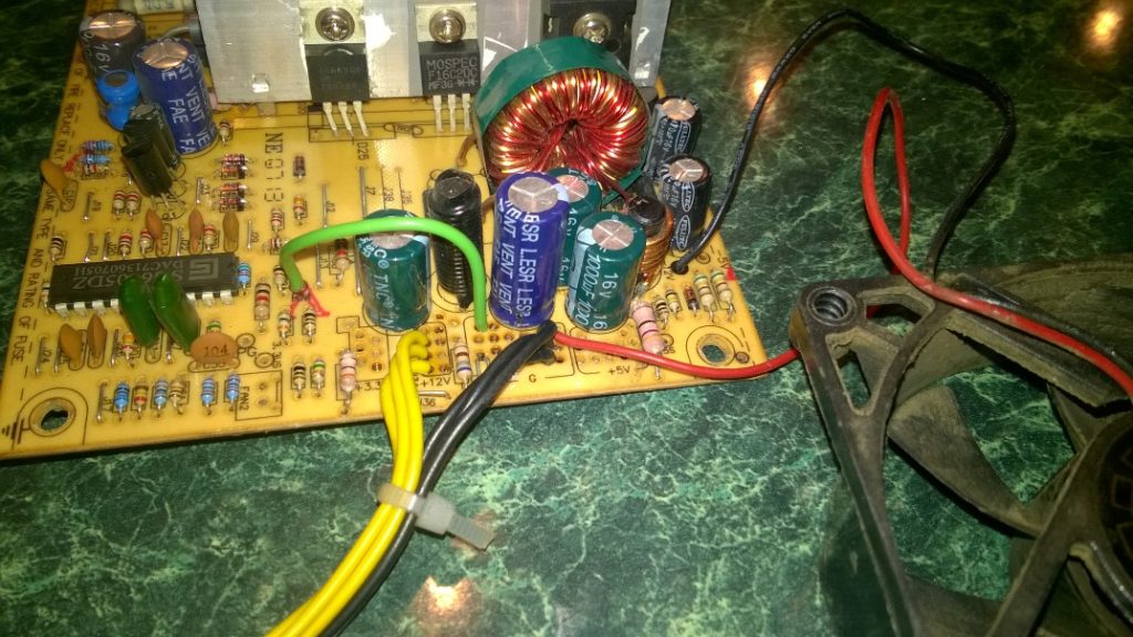 - питание вентилятора лучше переключить на шину (- 12 В), это устранит проблему запуска вентилятора от заряжаемой АКБ (черный провод вентилятора на шину -12 В, а красный провод вентилятора на минус БП).