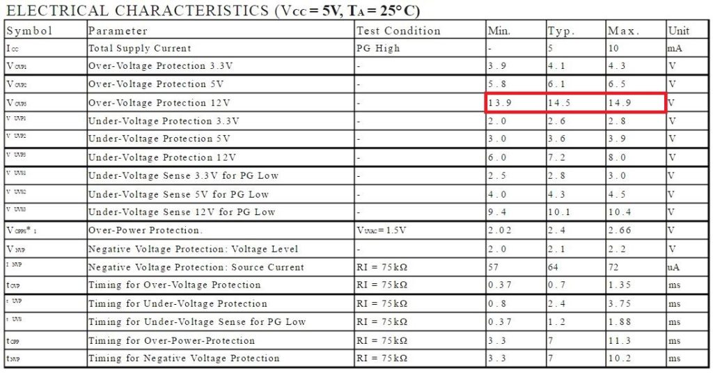 Из даташита SG6105 видно, что это уже порог не только по шине +12 В, если замерить напряжение на шинах +5 В и +3,3 В, то станет ясно, что на них напряжение тоже находятся на грани срабатывании защиты.