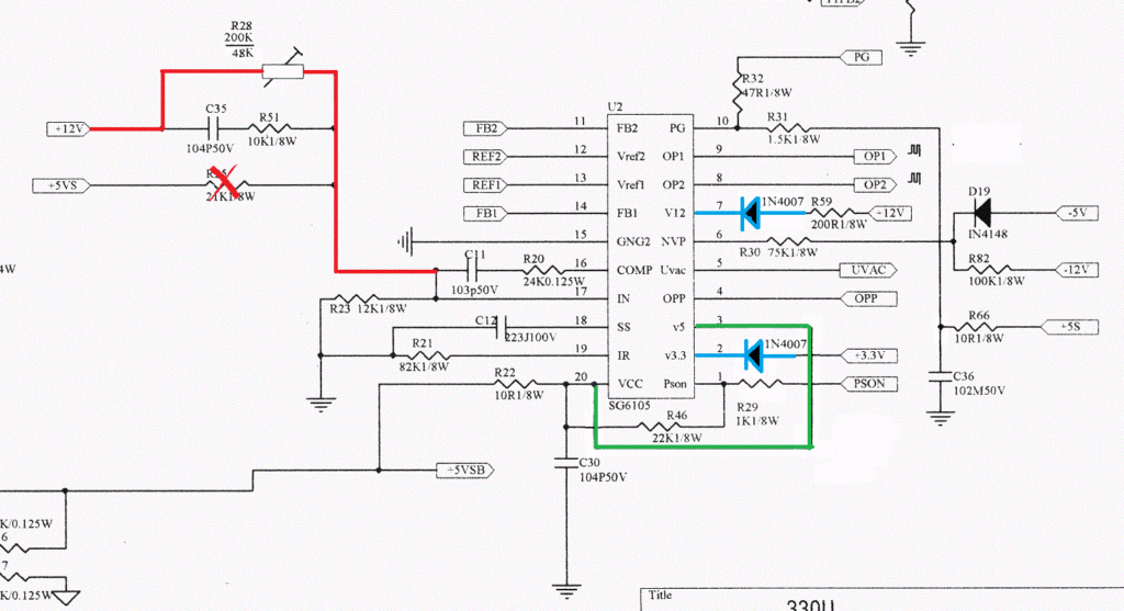 Опять теория. №3 отвечает за мониторинг напряжения по шине +5 В. Почему не стоит подключать диод перед выводом №3? При неравномерной нагрузки на шины (основная нагрузка ляжет на шину +12 В) напряжение на шине + 5 В сдвигается очень сильно и SG6105 уводит БП в защиту. Сдвиг по шине 3,3 В тоже будет, но незначительный для срабатывания защиты.