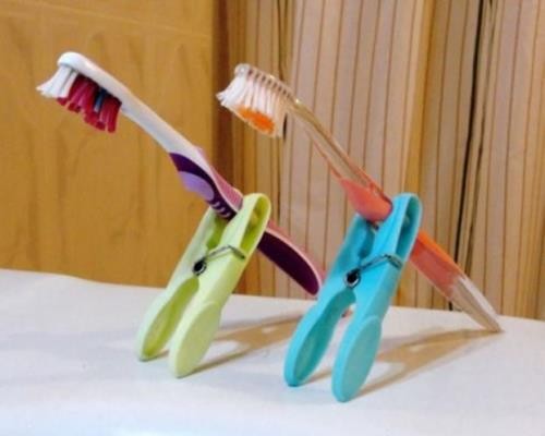 - Если специальная подставка для зубных щеток отсутствует, следует обратиться к обычным прищепкам. Они позволят оригинально и эффективно хранить предметы гигиены.