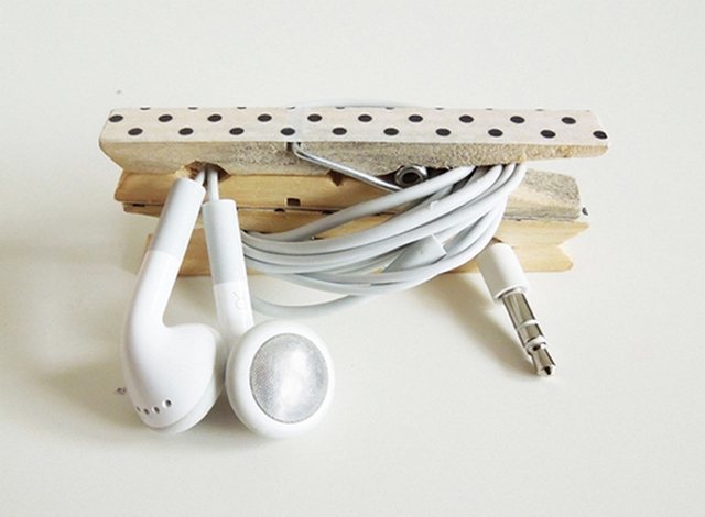Обычные бельевые прищепки могут пригодиться вам не только для сушки белья. Например, используя обычную прищепку, можно хранить наушники.