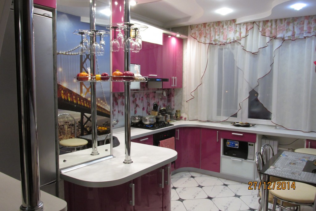 В кухне, как и в любом помещении, все должно быть гармонично. При наличии крупного гарнитура с эффектными поверхностями оформление окна должно соответствовать – скромность будет просто неуместна.