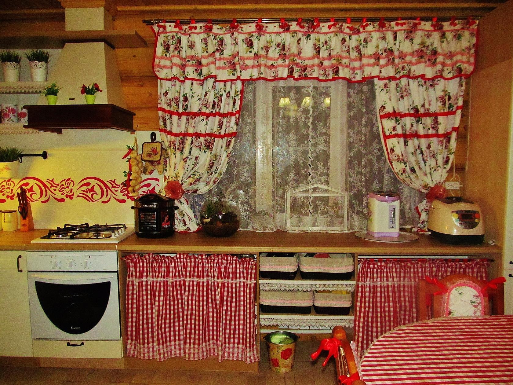 Ламбрекен в духе славянских традиций может быть украшен вышивкой в народном стиле или мережкой. Светлые легкие натуральные ткани будут очень гармоничны в дизайне такой кухни.