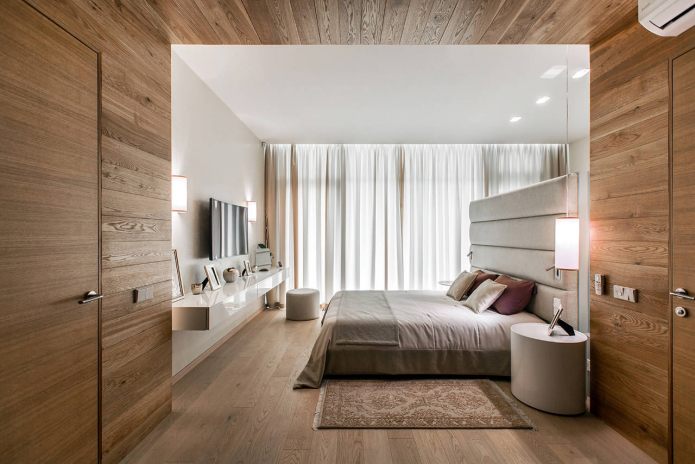 На фото спальная комната в современном стиле. Одно из достоинств ламината – возможность облицевать им не только пол, но и стены.