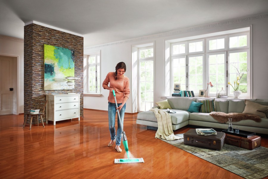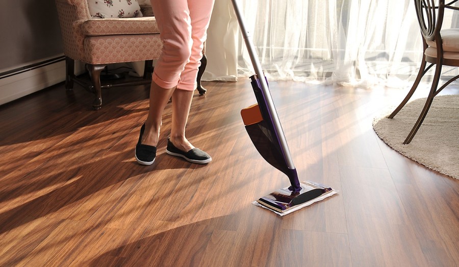 Убирать напольное покрытие можно с использованием пылесоса или веника. Единственное, чего боится ламинат, – это обилия влаги. Поэтому протирать его нужно не мокрой, а слегка влажной тряпкой.