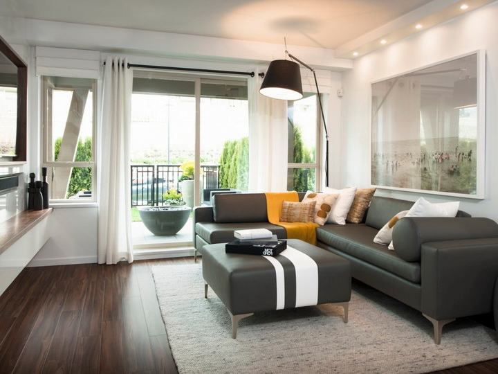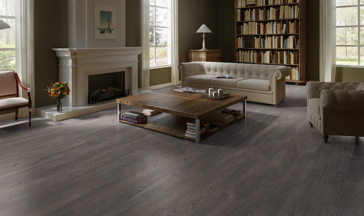 Для гостиной ламинат в темных и сероватых тонах может произвести фурор среди гостей. Изысканность в этом случае должна подчеркиваться общей спокойной цветовой гаммой в холодных тонах.