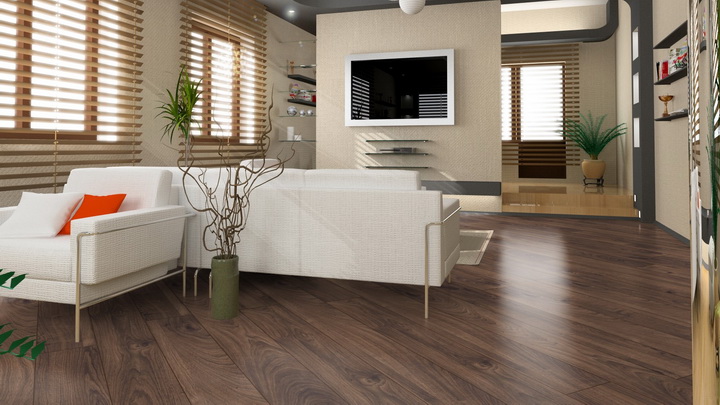 Это напольное покрытие представляет собой многослойный материал с основой из ДСП или ДВП. Слои пропитаны синтетическими смолами, а верхний слой состоит из бумаги, на которой можно напечатать любое изображение. Чаще всего ламинат имитирует натуральное дерево.
