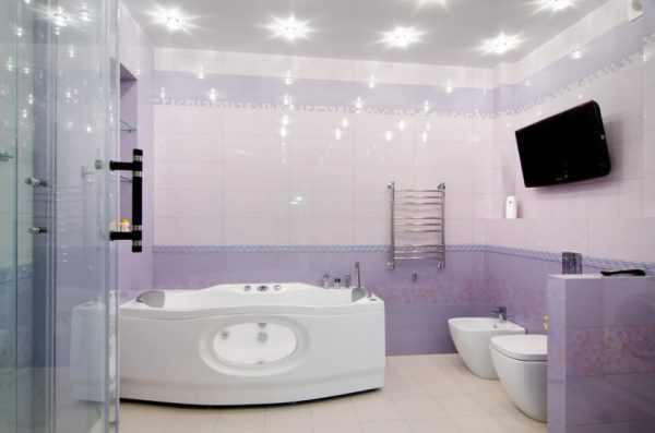 Комната для купания редко бывает просторной, поэтому увлекаться применением насыщенных, ярких оттенков не стоит. Лавандовый должен быть нежным, пастельным, совмещаться с розовым, серебристым или белым, бежевым. Это исключит визуальное уменьшение размеров комнаты и обеспечит оригинальность, оптимизм интерьера. В ванной больших габаритов разрешается сочетать светло-лавандовый с темно-фиолетовыми оттенками, которые можно применять для зонирования или выделения отдельных элементов.