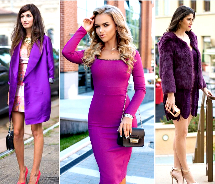 Яркий фиолетовый цвет сложно не заметить, он привлекает всеобщее внимание. Наряд такой расцветки смотрится по-праздничному, другие яркие тона (темно-синие, пестрые) усиливают этот эффект