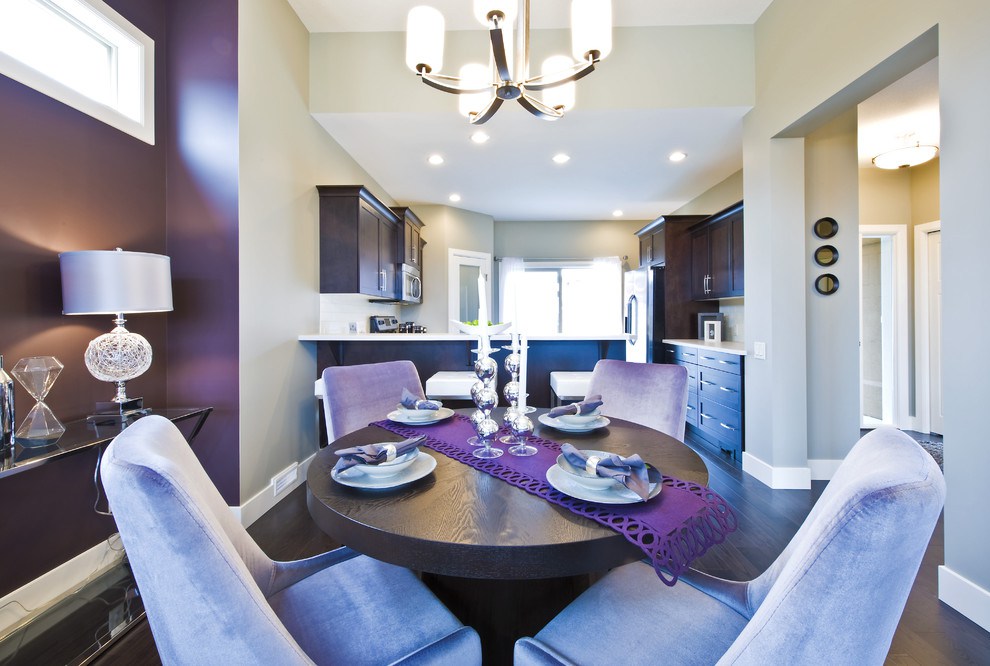 На кухне к присутствию лавандового тона нужно отнестись аккуратно. Обычно его используют в осуществлении модного дизайнерского приема, который называется «акцентной стеной». Также лаванду можно применить в декорировании столовой зоны либо установить обеденную группу такого цвета в комбинации со светлыми предметами мебели.