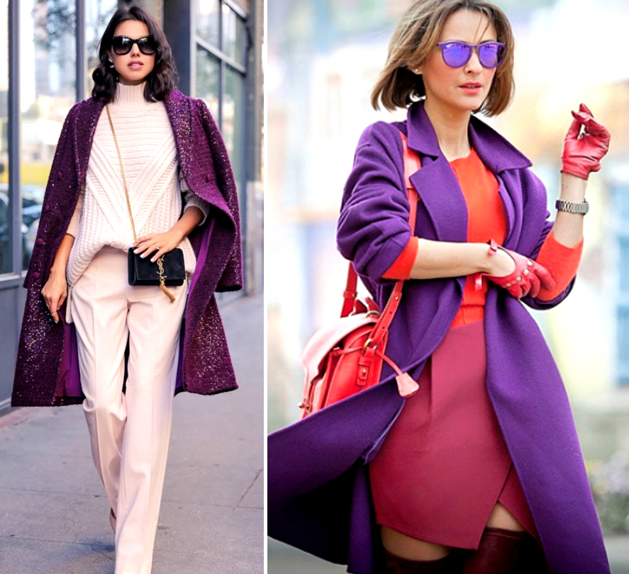 В любом из перечисленных модных образов гармонично будет смотреться сочетание темно-фиолетового с бледно-сиреневым. Когда надетый наряд кажется чересчур простым и скучным, можно разбавить его украшениями либо аксессуарами похожего тона, например, розовой сумочкой или шарфиком