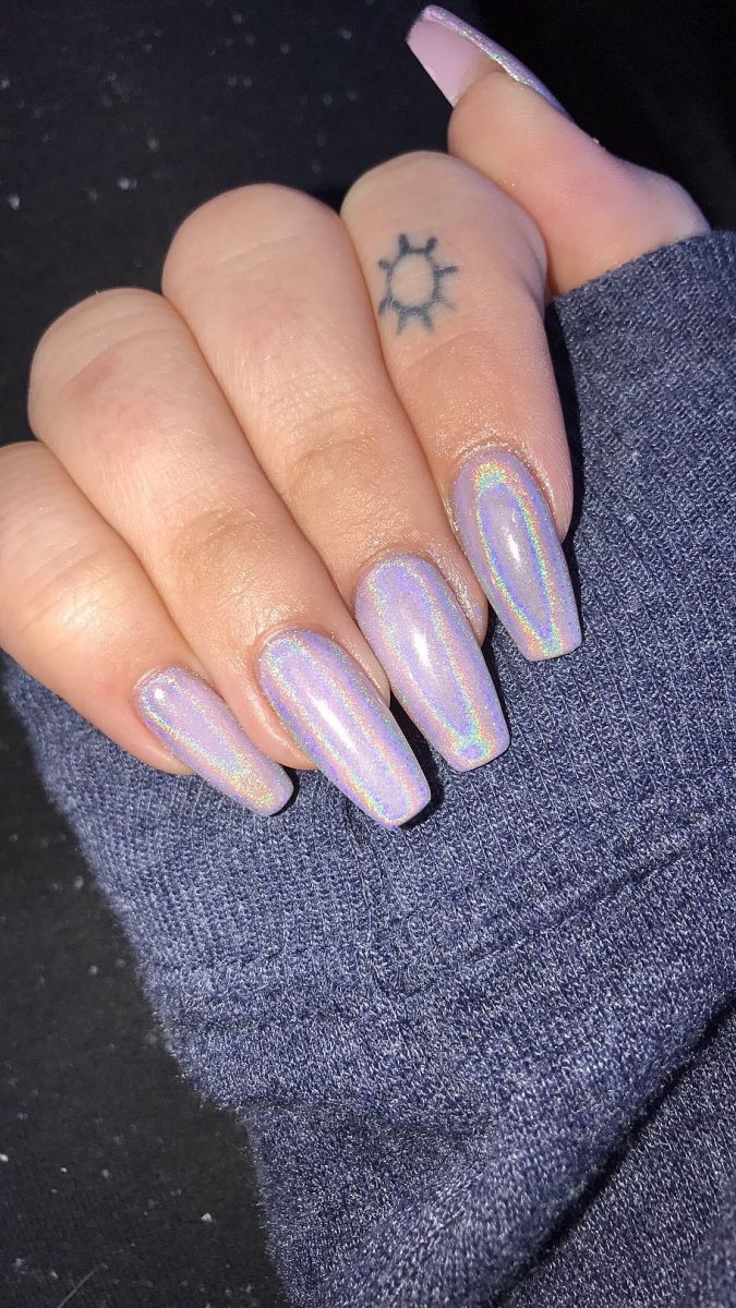 Также реализовать сочетание фиалкового или лавандового с серебром можно при помощи специальной фольги. Она наклеивается на ногтевую пластину, а затем слегка надрывается, так, чтобы остались на ногте только серебряные вкрапления, имитирующий дождь.