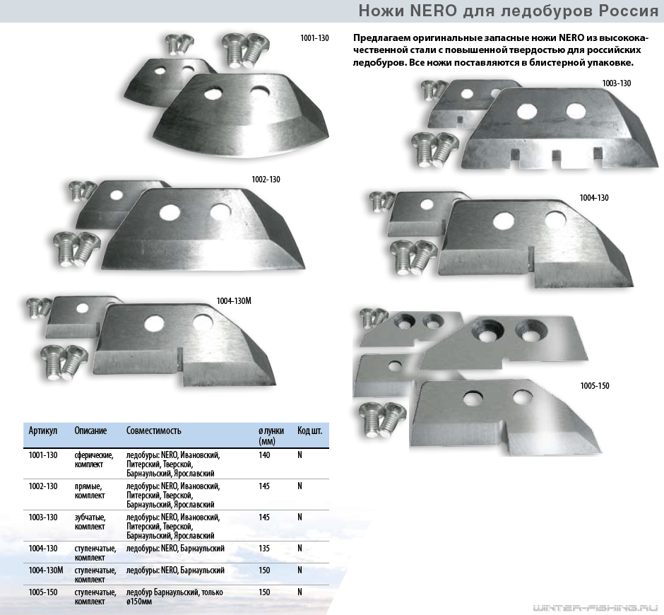 Ножи ледобуров «НЕРО» совместимы с ножами ледобуров других производителей: Ивановских, Ленинградских, Тверских, Барнаульских, и Ярославских. Кроме ножей для ледобура диаметром бурения 150 мм.