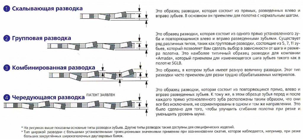 Защищающим. Развод заключается в загибании двух зубьев. При этом третий остается на месте. Предназначается для ленточных пил по обработке особо твердого материала. По форме каждый третий зуб напоминает трапецию. Местом расположения является центр полотна. С его помощью осуществляется максимально правильное направление пильной ленты.