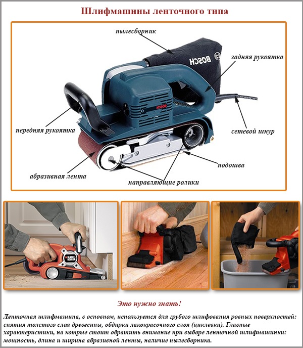 Ленточная шлифовальная машинка применяется в основном для существенной корректировки больших плоских поверхностей. Благодаря своим высоким рабочим характеристикам, с ее помощью можно снимать толстые слои материала, который поддается воздействию абразива.